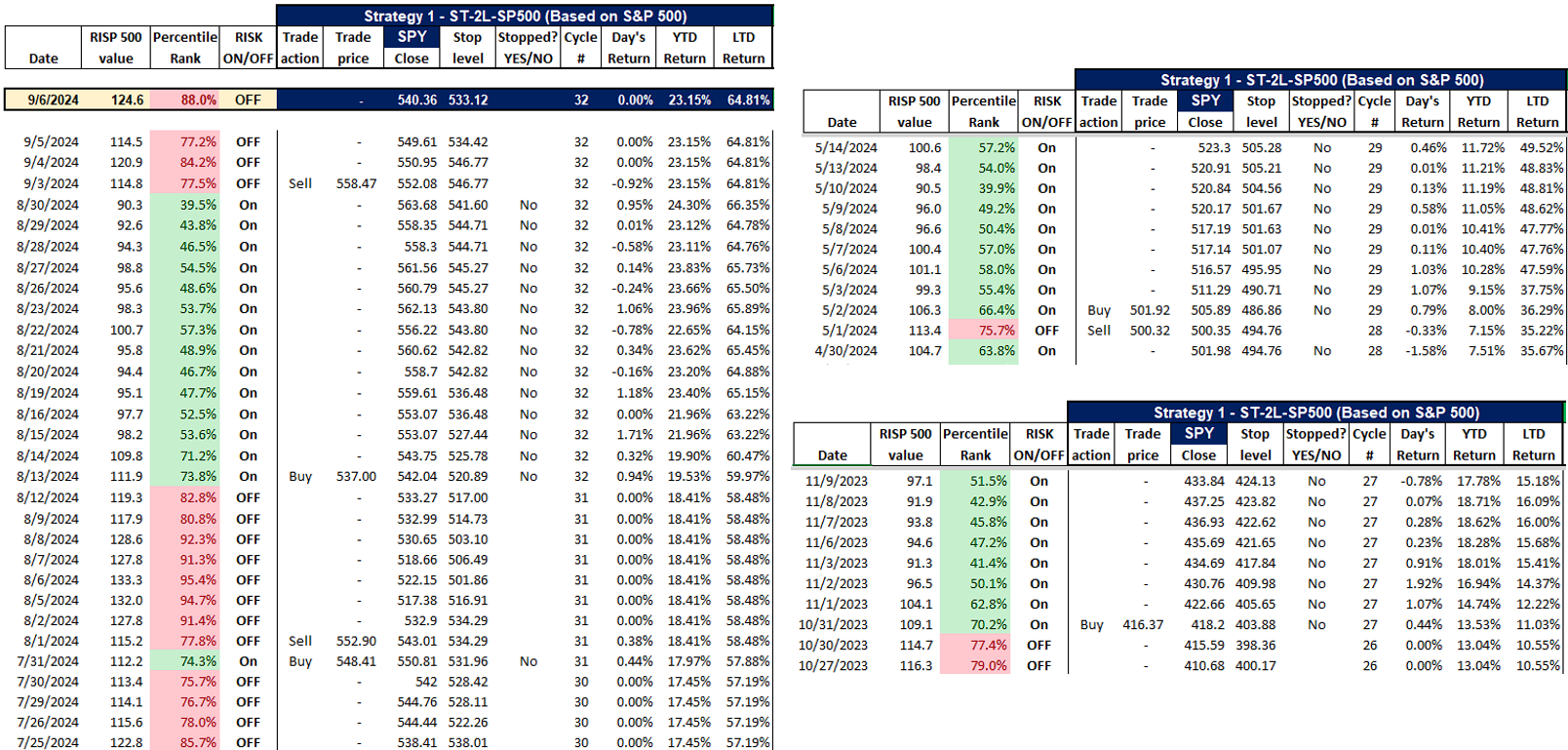 For these strategies (to prove the concept), RISP 500 is measured only once a day: trade only when risk level changes. This results in very low turnover (less than 2-3 trades per month, on average).