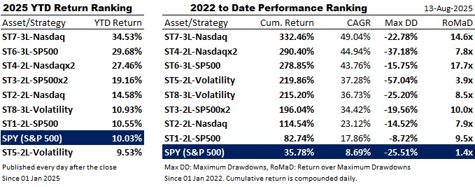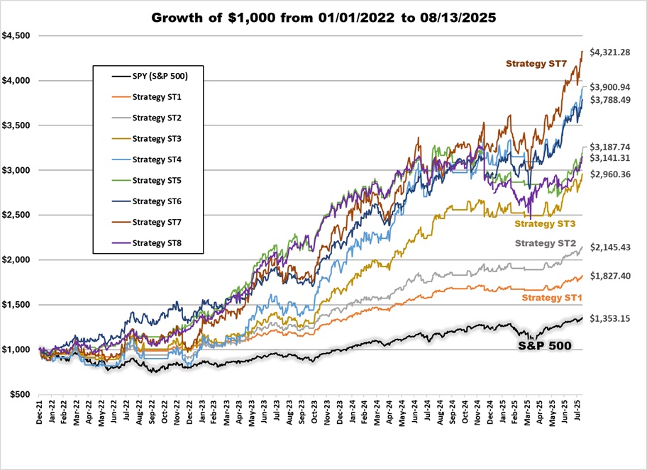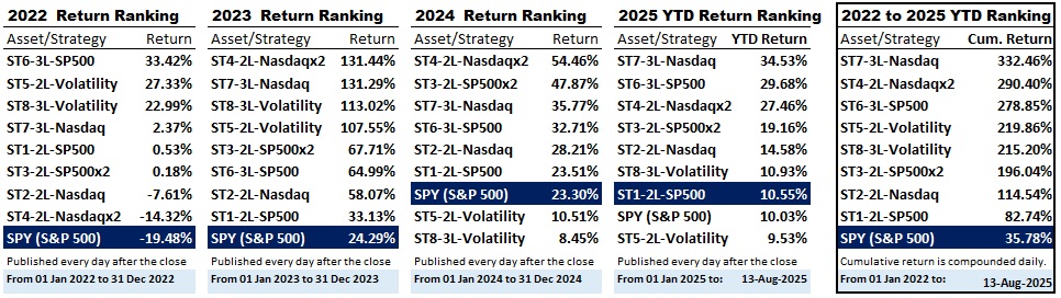 Note that strategies are ordered from the simplest and most conservative (Strategy 1: SPY or Cash) to the most advanced and aggressive (Strategy 8).