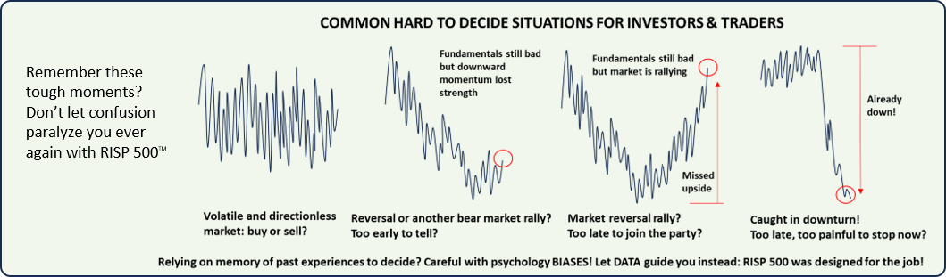 Great! We believe adding RISP 500 to your toolbox to work with them will help you be even more successful. SMIGRM may work on its own but it can also work in tandem with any other methods and strategies, helping them perform better! For example, you may be a great stock picker and portfolio manager, but you still need a market timing tool and a data-based sensitive warning mechanism to alert you of upcoming dangers coming from nowhere. Remember, we will never tell you what to do. You are always the decision maker. RISP 500 is another tool that provides you valuable information about the risks in the market. We believe risk is an important piece of the puzzle to help you visualize the investment landscape to make decisions.