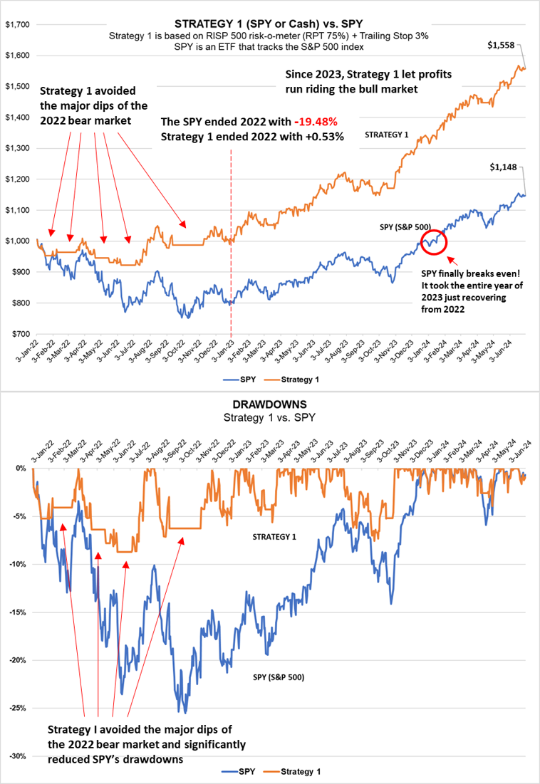 Most importantly: Note how Drawdowns of Strategy 1 are much smaller than those of the SPY: