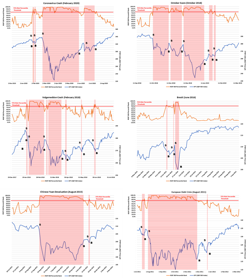 HOW IT WORKS: The RPT is a cutoff line (in red) above which risks measured by the RISP 500 Percentile Rank are rejected. When that happens, it's time to go RISK OFF (sell risk positions or seek hedge). Otherwise, it's RISK ON (safer to hold risk positions).